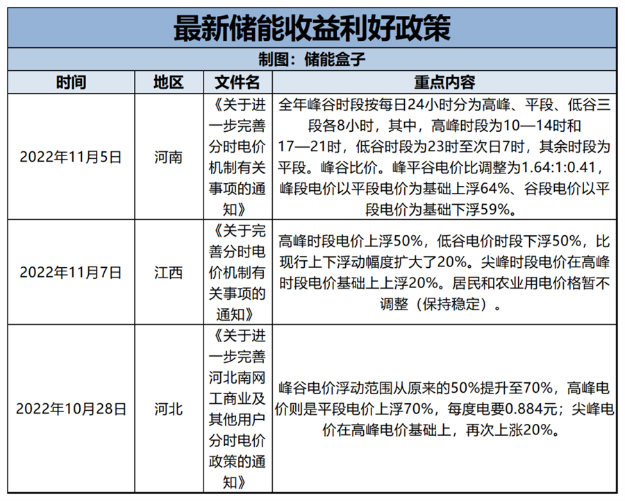 此外,國(guó)內(nèi)新能源發(fā)電發(fā)展較為積極的河北、河南、江西等省,也陸續(xù)出臺(tái)了大幅利好儲(chǔ)能收益的新政策。最直觀的政策類型就是拉大峰谷電價(jià)差,提升電價(jià)水平,儲(chǔ)能主要收益大幅提升。