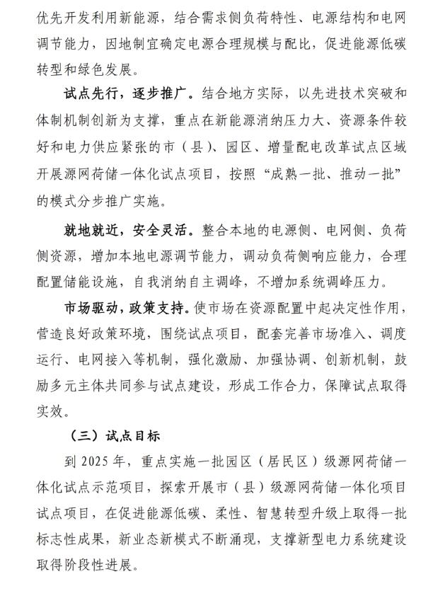 試點目標(biāo):到2025年,重點實施一批園區(qū)(居民區(qū))級源網(wǎng)荷儲一體化試點示范項目,探索開展市(縣)級源網(wǎng)荷儲一體化項目試點項目,在促進能源低碳、柔性、智慧轉(zhuǎn)型升級上取得一批標(biāo)志性成果,新業(yè)態(tài)新模式不斷涌現(xiàn),支撐新型電力系統(tǒng)建設(shè)取得階段性進展。