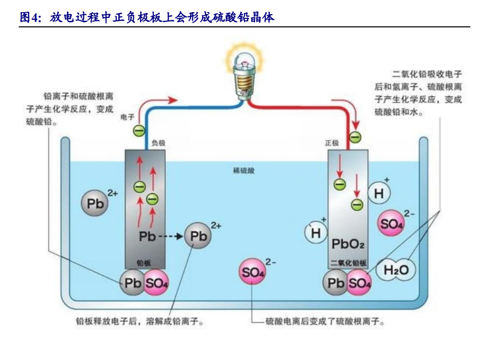 鉛酸電池包含正極板組、負極板組、隔板、電解液、容器等結構組成。正極板 活性物質為二氧化鉛,負極板主要活性物質為鉛。放電過程中正負極板上會形成細 小松軟的硫酸鉛晶體,充電過程中硫酸鉛歧化為鉛與二氧化鉛。