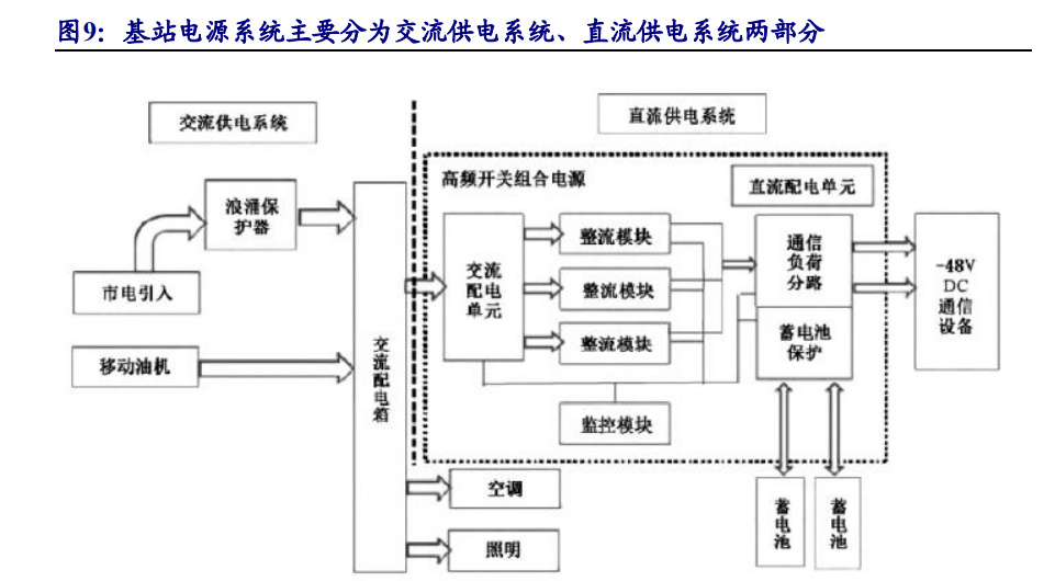 通信儲能作為通信基站的配套基礎設施,是保障通信系統(tǒng)實現(xiàn)可靠運行的關鍵。 開年以來,北京、上海、深圳、寧夏、大連、吉林等省市宣布 5G 基站建設目標,1 月 31 日,北京宣布將在 2023 年新建 1 萬個以上 5G 基站;2 月 8 日,寧夏宣布將在 2023 年新建 5G 基站 2000 個,累計達到 13000 個;2 月 11 日,上海計劃 2023 年新 建 1 萬個 5G 基站;2 月 10 日,深圳市工信局發(fā)布《深圳市極速先鋒城市建設行動 計劃》,計劃指出要全面提升 5G 網絡能效,全年新增 5G 基站 10000 個。2 月 13 日, 吉林省通信管理局公布 5G 基站相關數(shù)據(jù):2022 年建成 5G 基站 13042 個,累計建成 5G 基站 34092 個,并宣布了 2023 年目標:力爭新建 5G 基站 8000 個。2 月 14 日, 大連市通信管理局宣布全年全域將新建 5G 基站 4000 個以上,力爭年底建成 19000 個 5G 基站,重點場所網絡通達率提升至 99%。 我國 5G 基站的建設運營模式主要采用中國鐵塔建塔、引電建設基礎配套設施, 移動、聯(lián)通、電信三大主運營商租塔、安裝設備并進行網絡運營的模式,運營電費 由鐵塔代運營商統(tǒng)一向電力部門繳納。5G 基站開通后電費成本開支已高于鐵塔租費, 較大的 5G 基站耗電量已經成為阻礙 5G 和制約行業(yè)發(fā)展的一個重要因素。利用儲能 裝置在負荷高峰時期放電,負荷低谷時期從電網充電,減少高峰負荷需求,節(jié)省用電費用,從而達到改善負荷特性、參與系統(tǒng)調峰的目的,同時節(jié)省電費、最大限度 套利。 基站電源系統(tǒng)主要分為交流供電系統(tǒng)、直流供電系統(tǒng)兩部分。交流供電系統(tǒng)包 含市電引入、移動油機、浪涌保護器、交流配電箱等。直流供電系統(tǒng)包含高頻開關 組合電源,蓄電池等。