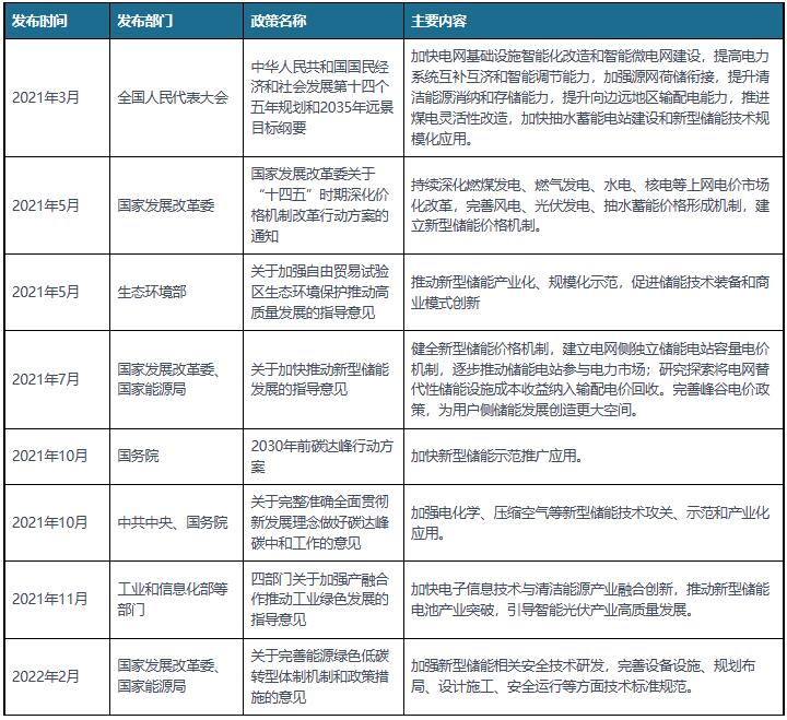 為加快新型儲能示范推廣應(yīng)用,我國發(fā)布了一系列行業(yè)政策,如2022年國家發(fā)展改革委、國家能源局發(fā)布的《關(guān)于加快推動新型儲能發(fā)展的指導(dǎo)意見》提出健全新型儲能價格機制,建立電網(wǎng)側(cè)獨立儲能電站容量電價機制,逐步推動儲能電站參與電力市場;研究探索將電網(wǎng)替代性儲能設(shè)施成本收益納入輸配電價回收。完善峰谷電價政策,為用戶側(cè)儲能發(fā)展創(chuàng)造更大空間。