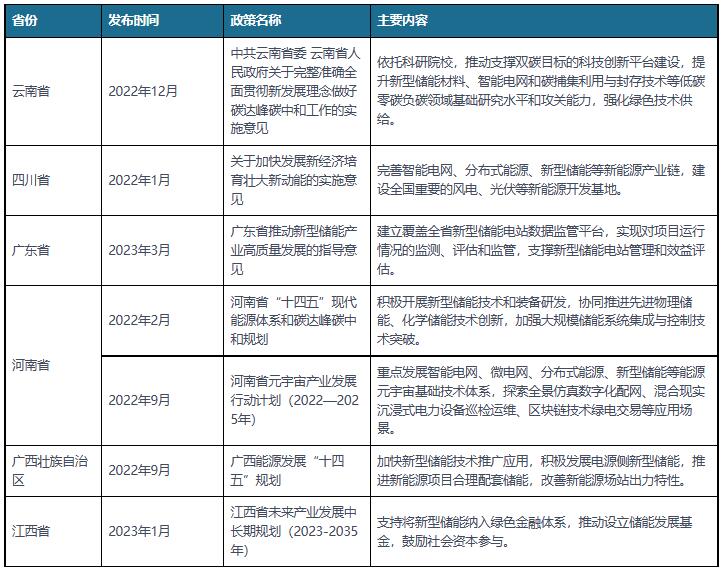 我國各省市也積極響應(yīng)國家政策規(guī)劃,對各省市新型儲能行業(yè)的發(fā)展做出了具體規(guī)劃,支持當?shù)匦滦蛢δ苄袠I(yè)穩(wěn)定發(fā)展,比如四川省發(fā)布的《關(guān)于加快發(fā)展新經(jīng)濟培育壯大新動能的實施意見》提出完善智能電網(wǎng)、分布式能源、新型儲能等新能源產(chǎn)業(yè)鏈,建設(shè)全國重要的風電、光伏等新能源開發(fā)基地。