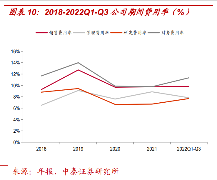 期間費(fèi)用呈下降趨勢(shì),但仍有較大進(jìn)步空間。2019-2021 年公司期間費(fèi) 用率分別為 36.3%/45.3%/33.8%/35.1%/36.7%,雖然呈現(xiàn)總體下降趨勢(shì), 但仍高于同行平均值,費(fèi)用管控能力有望進(jìn)一步提升。其中 2022 年前 三季度銷售/管理/研發(fā)/財(cái)務(wù)費(fèi)用率分別為 9.8%/7.8%/7.7%/11.3%,打破 前兩年的下降趨勢(shì),主要是因?yàn)楣臼杖塍w量較低,規(guī)模效應(yīng)尚未體現(xiàn), 且公司近年來營(yíng)運(yùn)資金緊缺,導(dǎo)致公司主動(dòng)放棄大量周期長(zhǎng)、墊資金額高的訂單,也限制了營(yíng)收規(guī)模的增長(zhǎng),導(dǎo)致各方面人效降低。但隨著公 司業(yè)務(wù)擴(kuò)張的不斷推進(jìn)和資金鏈的緩解,期間費(fèi)用率有望好轉(zhuǎn)。