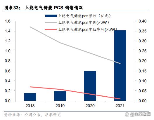 大儲(chǔ)是 B 端市場(chǎng),廠商價(jià)格直面競(jìng)爭(zhēng),產(chǎn)品優(yōu)勢(shì)公司脫穎而出。儲(chǔ)能 PCS 在初期單價(jià)和毛 利率較高,隨著頭部廠商不斷擴(kuò)產(chǎn)和新的廠商不斷進(jìn)入,產(chǎn)業(yè)競(jìng)爭(zhēng)加劇,價(jià)格和毛利率逐 漸走低。上能電氣 2018 年儲(chǔ)能 PCS 營(yíng)收 0.15 億元,產(chǎn)品單價(jià) 0.37 元/W,2022 年儲(chǔ)能 PCS 營(yíng)收 1.42 億元,較 2018 年增長(zhǎng)近 9 倍,產(chǎn)品單價(jià) 0.19 元/W,降幅 50%,規(guī)模效應(yīng) 盡顯。陽(yáng)光電源光伏逆變器價(jià)格穩(wěn)中有降,由 2018 年 0.22 元/W 降至 2022 年 0.19 元/W。