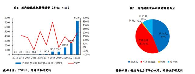 國內(nèi)儲能裝機(jī)有望持續(xù)增長,表前儲能為裝機(jī)主力。根據(jù)CNESA數(shù)據(jù)統(tǒng)計,2012-2022年間國內(nèi)新型儲能新增裝機(jī)復(fù)合增 速高達(dá)95%。2022年國內(nèi)新型儲能新增裝機(jī)高達(dá)7.3GW,同比增長近200%。就國內(nèi)儲能裝機(jī)類型分布而言,根據(jù)儲能與 電力市場公眾號統(tǒng)計,可再生能源配儲與獨立儲能裝機(jī)占比分別為45%與44%,用于調(diào)頻的裝機(jī)占比僅為1%,工商業(yè)用 戶側(cè)儲能裝機(jī)占比10%。我國當(dāng)前的儲能類型主要還是以用于配套新能源裝機(jī)的表前儲能裝機(jī)為主。