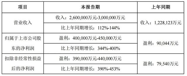 此外,最受關注的是其凈利潤的數(shù)據(jù),預計實現(xiàn)40-45億,同比增長344%-400%,而扣非凈利增幅更甚,同增更是高達390%-453%。