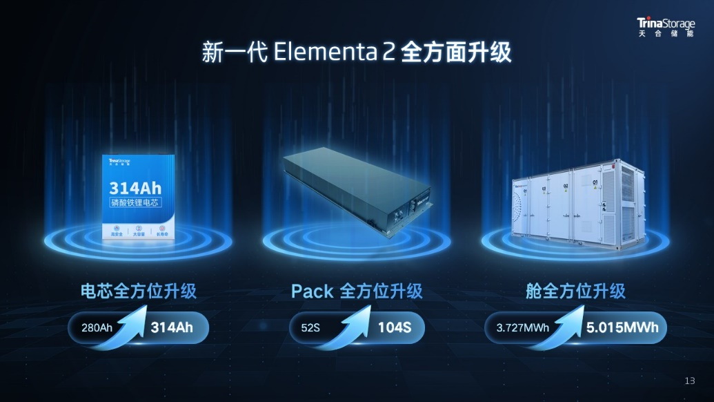 新一代柔性液冷電池艙Elementa 2系統(tǒng)能量由原先一代的3.727MWh提升至5.015MWh,采用的是自研自產(chǎn)的314Ah天合芯。在20尺柜的使用場景下,314Ah可剛好形成5MWh的系統(tǒng)容量,相比于320Ah,電池子陣超配量更少,可以降低客戶的初始投資成本,達成20尺儲能系統(tǒng)標(biāo)準(zhǔn)空間下容量與成本的最優(yōu)平衡。