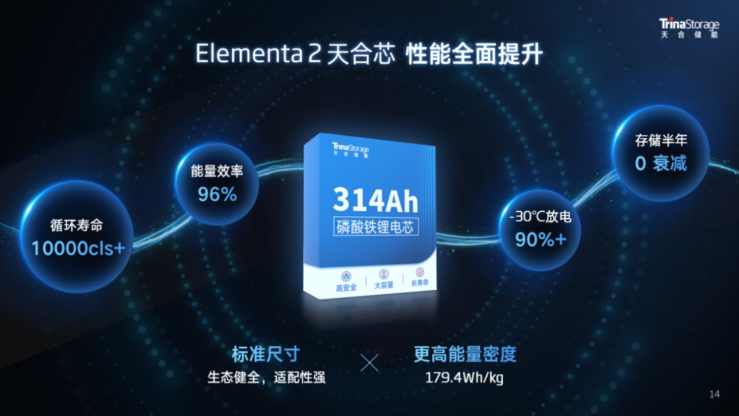 通過優(yōu)化電芯結(jié)構(gòu)和智造工藝,天合自研高安全、高能量密度的314Ah儲能專用電芯,循環(huán)壽命可達10000cls+,能量密度179.4Wh/kg,能量效率高達96%,同時采用主流標(biāo)準(zhǔn)的71173尺寸,完美適配當(dāng)前主流系統(tǒng)集成方案,實現(xiàn)同尺寸下系統(tǒng)能量的顯著提升。