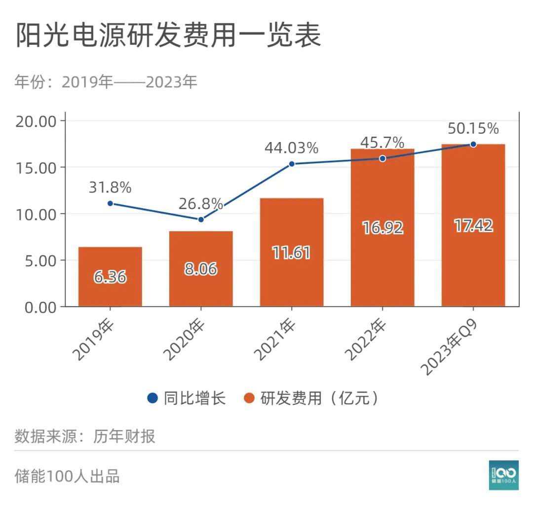 事實(shí)上,陽光電源自1997年成立起,26年來一直不斷加大科研投入,時(shí)刻不忘技術(shù)創(chuàng)新。截至目前,其在合肥、上海、南京、深圳、德國、荷蘭有六大研發(fā)中心,研發(fā)人員占比40%,2023年前三季度研發(fā)費(fèi)用投入17.42億元。申請(qǐng)專利5300余項(xiàng),持有數(shù)業(yè)內(nèi)第一。