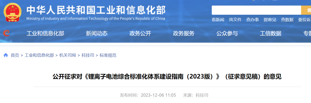 工信部公開征求對(duì)《鋰離子電池綜合標(biāo)準(zhǔn)化體系建設(shè)指南(2023版)》(征求意見稿)的意見