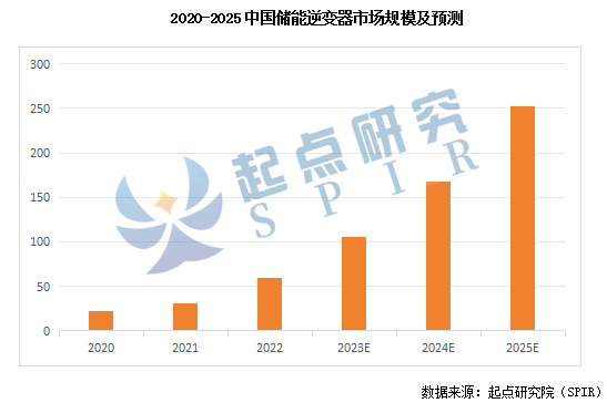 近年來,我國(guó)儲(chǔ)能市場(chǎng)呈現(xiàn)出高速增長(zhǎng)態(tài)勢(shì)(國(guó)家能源局?jǐn)?shù)據(jù),2023年上半年國(guó)內(nèi)新型儲(chǔ)能新增裝機(jī)8.63GW/17.72GWh,接近歷年累計(jì)裝機(jī)總和),催生對(duì)于儲(chǔ)能逆變器的巨大需求,儲(chǔ)能逆變器市場(chǎng)前景廣闊。據(jù)起點(diǎn)研究院(SPIR)數(shù)據(jù)和預(yù)測(cè),2022年中國(guó)儲(chǔ)能逆變器市場(chǎng)規(guī)模達(dá)60億元,2023年將達(dá)105億元,同比增速達(dá)75%,預(yù)測(cè)到2025年達(dá)252億。