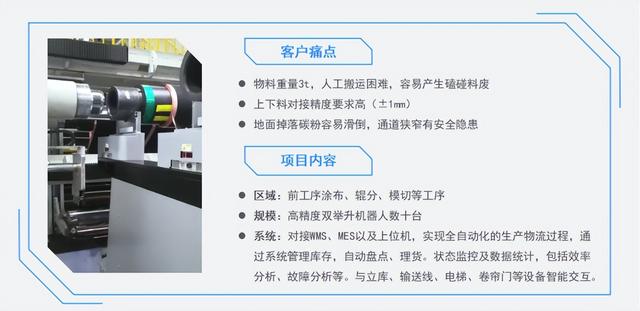在某儲(chǔ)能頭部企業(yè)實(shí)現(xiàn)產(chǎn)線物流無人化的項(xiàng)目中,磅旗無人工場數(shù)字化方案籠罩前段與中段產(chǎn)線物流全過程,包含涂布上下料、極卷緩存搬運(yùn)、輥壓分切上料、輥壓分切下料、模切上下料、卷繞上料、隔閡運(yùn)輸、空卷筒回流運(yùn)輸?shù)裙に囘^程。實(shí)現(xiàn)全過程主動(dòng)化、無人化、物料多級(jí)智能拉動(dòng)、上下工序智能協(xié)同。
