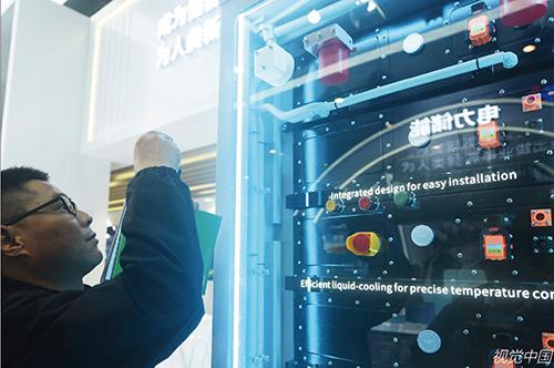 2024年3月11日,杭州,觀眾在中國(guó)國(guó)際儲(chǔ)能大會(huì)參觀億緯鋰能的液冷儲(chǔ)能設(shè)施。