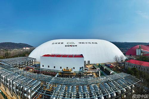2024年1月9日,安徽省蕪湖市,繁昌區(qū)繁陽(yáng)鎮(zhèn)庫(kù)山村,航拍正在并網(wǎng)發(fā)電的海螺集團(tuán)10MW/80MWh二氧化碳儲(chǔ)能示范系統(tǒng)項(xiàng)目。