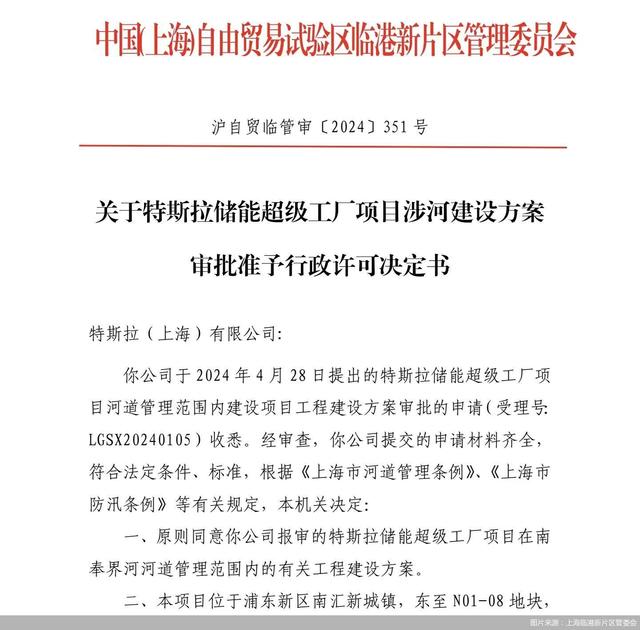 5月8日,上海臨港新片區(qū)管委會官網(wǎng)顯示,已公布關(guān)于與特斯拉儲能超級工廠項目涉河建設(shè)方案審批準(zhǔn)予行政許可決定書,同意特斯拉(上海)報審的特斯拉儲能超級工廠項目在南奉界河河道管理范圍內(nèi)的有關(guān)工程建設(shè)方案。