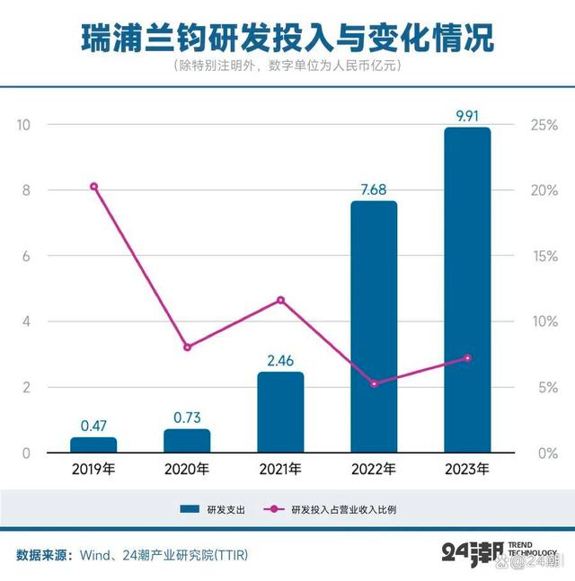 而瑞浦蘭鈞的技術(shù)突破與持續(xù)且強(qiáng)力的研發(fā)投入有很大關(guān)系。24潮產(chǎn)業(yè)研究院(TTIR)分析發(fā)現(xiàn),近幾年瑞浦蘭鈞研發(fā)投入一直保持增長趨勢,2023年其研發(fā)支出為9.91億元,同比增長了29.04%,研發(fā)投入占營業(yè)收入比例由2022年的5.24%提升至2023年的7.20%。