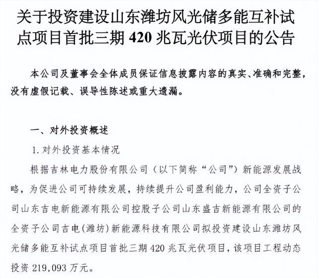 公告表示,公司全資子公司山東吉電新能源有限公司控股子公司山東盛吉新能源有限公司的全資子公司吉電(濰坊)新能源科技有限公司擬投資建設(shè)山東濰坊風(fēng)光儲(chǔ)多能互補(bǔ)試點(diǎn)項(xiàng)目首批三期420兆瓦光伏項(xiàng)目,該項(xiàng)目工程動(dòng)態(tài)投資219,093萬元。