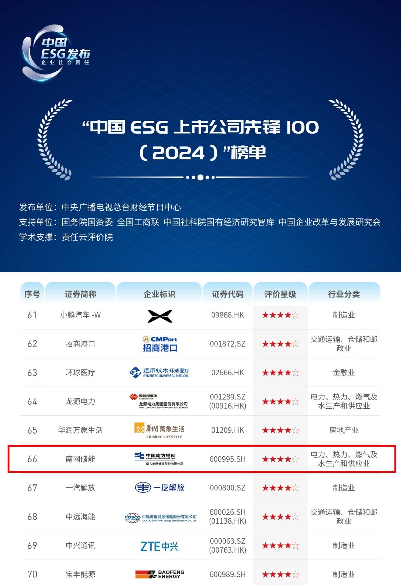提升26位!南網(wǎng)儲能蟬聯(lián)“中國ESG上市公司先鋒100”榜單