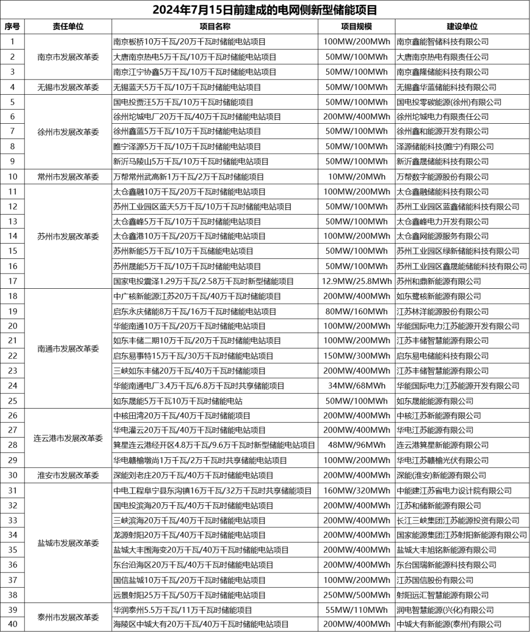 根據(jù)江蘇省2024年7月15日前建成的電網(wǎng)側(cè)新型儲能項(xiàng)目清單:
