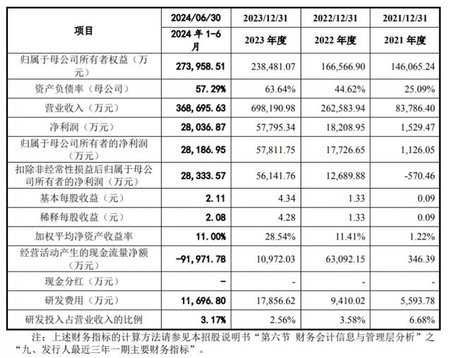 2021年-2024年上半年,其向前五名客戶合計(jì)的銷售額占營業(yè)收入的比例分別為78.16%、83.70%、74.37%和58.43%。