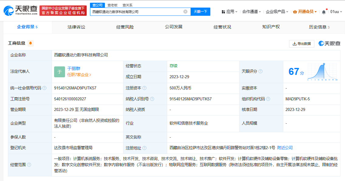 近日,西藏軟通動(dòng)力數(shù)字科技有限公司成立,法定代表人為于麗群,注冊(cè)資本500萬(wàn)人民幣,經(jīng)營(yíng)范圍包括數(shù)字文化創(chuàng)意軟件開(kāi)發(fā)、數(shù)字內(nèi)容制作服務(wù)、物聯(lián)網(wǎng)應(yīng)用服務(wù)、互聯(lián)網(wǎng)數(shù)據(jù)服務(wù)等。股東信息顯示,該公司由軟通動(dòng)力(301236)全資持股。