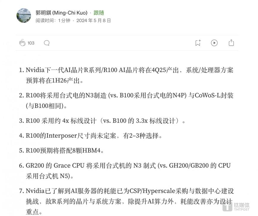 天風(fēng)國(guó)際證券分析師郭明錤指出,英偉達(dá)下一代R系列/R100 AI芯片將于2025年第四季度量產(chǎn),采用臺(tái)積電3nm制程、4個(gè)reticle設(shè)計(jì),搭配8顆HBM4,重點(diǎn)改善能耗。最早在明年,R100 AI GPU就將登場(chǎng)。