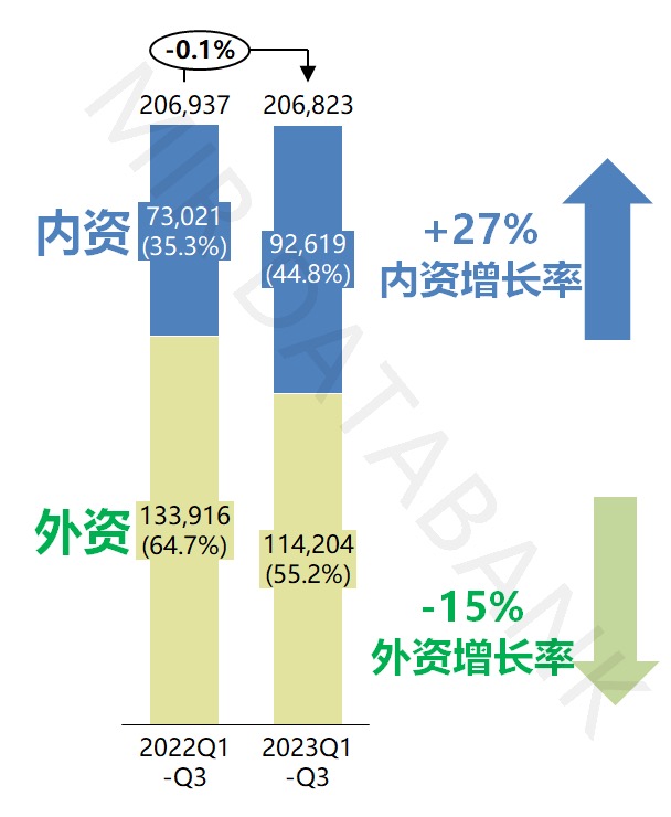 但我國近年來國產替代加速,導致內資廠商市場份額不斷提升。據(jù)MIR睿工業(yè)數(shù)據(jù):2023年第三季度,國產工業(yè)機器人廠商扛住了壓力,同比增速達26.8%,遠高于整體市場增速。且內資廠商市場份額持續(xù)增加,占比提升至45%。