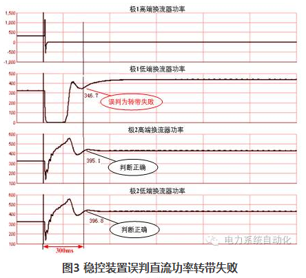 直流故障前后總損失的功率是穩(wěn)控系統(tǒng)執(zhí)行控制策略的重要依據(jù)。直流故障暫態(tài)過程復(fù)雜,若由穩(wěn)控裝置計(jì)算事故前功率與事故后的穩(wěn)態(tài)功率差,事故前后的時(shí)間窗口Δt難以確定。實(shí)踐表明:Δt過短(最初設(shè)計(jì)為30ms),可能會(huì)誤判健全換流器的轉(zhuǎn)帶;而延長Δt,即便是增加至300ms,在某些運(yùn)行工況下,仍然會(huì)出現(xiàn)誤判為轉(zhuǎn)帶失敗(如圖3)或誤判為轉(zhuǎn)帶成功(如圖4)的情況。經(jīng)過大量實(shí)驗(yàn)數(shù)據(jù)分析,若要確保在所有故障工況下裝置均不會(huì)誤判,則Δt至少需延長至500ms以上,無法滿足電網(wǎng)的穩(wěn)定控制需求。