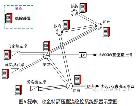 隨著多個(gè)特高壓交直流輸電通道的建成投產(chǎn),控制策略的設(shè)計(jì)和制定面臨新的要求,尤其體現(xiàn)在多個(gè)穩(wěn)控系統(tǒng)和控制策略間的協(xié)調(diào)控制方面。以復(fù)奉直流、賓金直流為例,為了解決兩大特高壓直流送出的穩(wěn)定問題,在復(fù)龍換流站、宜賓換流站、溪洛渡電廠等8個(gè)廠站配置了安全穩(wěn)定控制裝置,如圖5所示。經(jīng)計(jì)算,兩大直流故障后均可能會(huì)切除向左、向右以及溪左三個(gè)電廠的機(jī)組,兩個(gè)穩(wěn)控系統(tǒng)之間的控制措施有重疊。若按傳統(tǒng)的思路制定策略和實(shí)施方案,兩套穩(wěn)控系統(tǒng)間無信息交互和協(xié)調(diào),當(dāng)出現(xiàn)兩大直流同時(shí)雙極閉鎖的極端故障時(shí),某些機(jī)組會(huì)同時(shí)被兩個(gè)主站發(fā)來的命令切除,從而導(dǎo)致控制措施量不足。