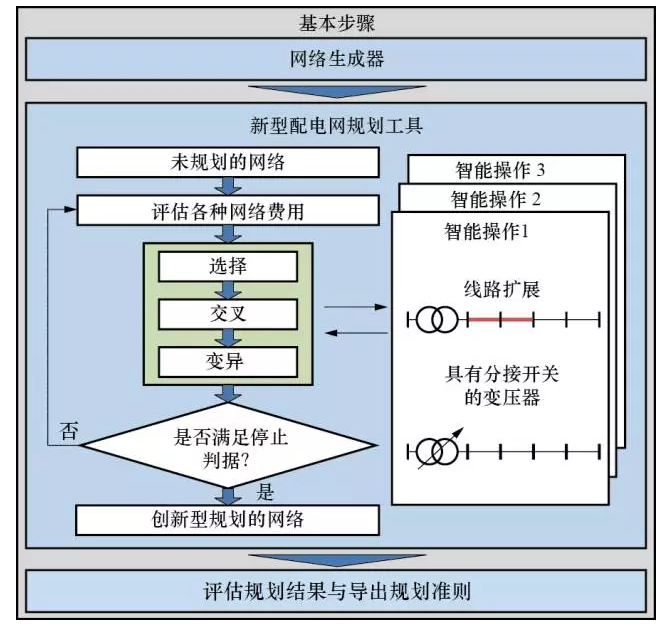 文獻(xiàn)[18]針對中、低壓配網(wǎng)提出一種基于遺傳算法(geneticalgorithm,GA)的規(guī)劃方法,如圖6所示。第一步,根據(jù)不同的供用電要求以及實(shí)際電網(wǎng)特征,生成特征各異的網(wǎng)絡(luò)結(jié)構(gòu);第二步,利用GA方法針對每種網(wǎng)絡(luò)結(jié)構(gòu)得到最優(yōu)的傳統(tǒng)建設(shè)方案和智能建設(shè)方案;最后,對所得方案進(jìn)行評估比較。運(yùn)用GA算法時(shí),每種符合運(yùn)行約束要求的電網(wǎng)配置方案都作為一個(gè)個(gè)體,每次迭代時(shí),以各種網(wǎng)絡(luò)成本(適應(yīng)度函數(shù))最小為目標(biāo),先隨機(jī)挑選兩個(gè)個(gè)體進(jìn)行交叉生成新個(gè)體,然后以減小成本為原則修改個(gè)體(變異),變異后計(jì)算潮流以驗(yàn)證網(wǎng)絡(luò)約束是否越限,如果越限,則通過擴(kuò)建線路等措施修改個(gè)體,或回退到變異之前的初始狀態(tài);此過程不斷繼續(xù),直到滿足收斂判據(jù)。另外,該方法還采用了所謂智能操作(smartoperator)來改善GA求解效率不高的缺陷,即利用一些有效措施(如中低壓變壓器分接頭切換和線路擴(kuò)建相結(jié)合)對當(dāng)前結(jié)果進(jìn)行智能化修正,加速找到最優(yōu)解的過程。