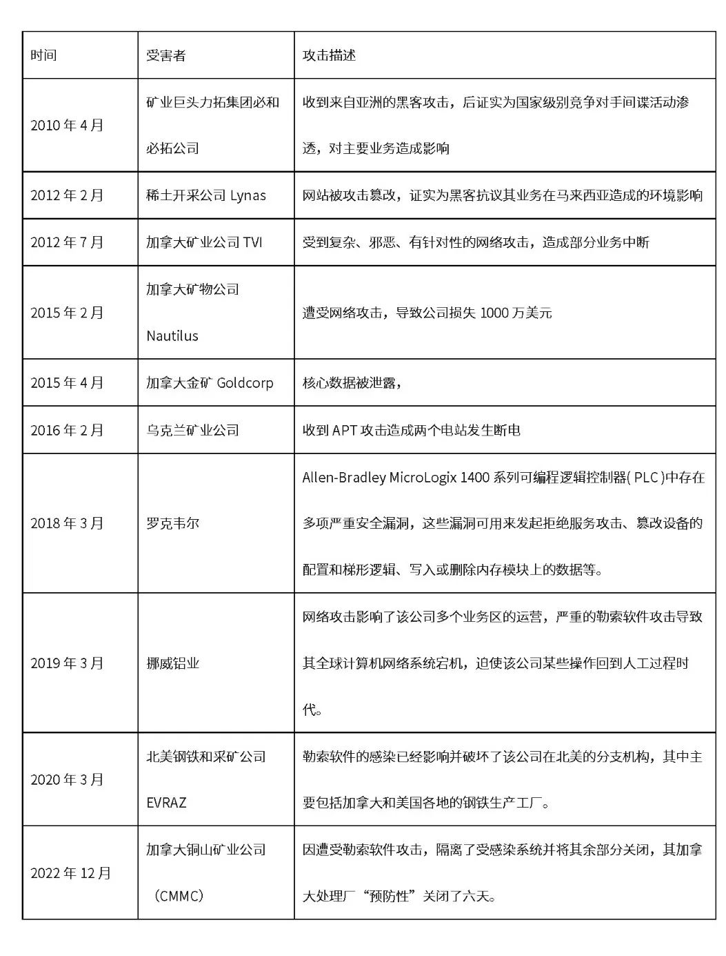 但隨著原有封閉的礦山工業(yè)控制系統(tǒng)與開(kāi)放的信息化系統(tǒng)融合,也帶來(lái)了大量的網(wǎng)絡(luò)安全威脅。而大型礦山企業(yè)工業(yè)網(wǎng)絡(luò)復(fù)雜,存在較多的管理薄弱環(huán)節(jié),更容易受到來(lái)自外部的惡意攻擊或內(nèi)部操作失誤所引起的網(wǎng)絡(luò)異常,由此造成停產(chǎn)和監(jiān)管部門(mén)處罰將會(huì)給企業(yè)造成大量損失。從國(guó)際上來(lái)看,有下列較為嚴(yán)重的網(wǎng)絡(luò)攻擊案例: