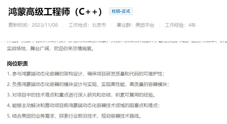 美團(tuán)發(fā)布了鴻蒙高級(jí)工程師、鴻蒙基建工程師等多個(gè)鴻蒙開發(fā)相關(guān)崗位。主要開發(fā)美團(tuán)鴻蒙App、大眾點(diǎn)評(píng)鴻蒙App。網(wǎng)易更新了高級(jí)/資深A(yù)ndroid 開發(fā)工程師崗位,職位要求參與云音樂多端多OS的產(chǎn)品(Android、鴻蒙等)研發(fā)迭代。
