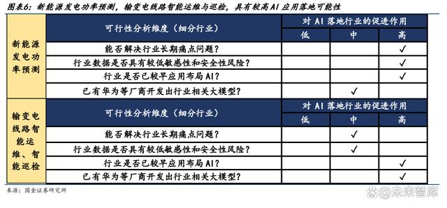 面向行業(yè)主要衡量的維度有: 1) 能否解決長期痛點問題:電網(wǎng)承擔最主要的功能是維持用電側(cè)與電網(wǎng)側(cè)動態(tài)平衡,而 新能源裝機比例上升無疑加大了電力調(diào)度與消納的難度,因此若 AI 加持能有效解決 消納相關細分環(huán)節(jié)的痛點問題,相關政策導向和資金投入將有望向此環(huán)節(jié)傾斜。 2) 行業(yè)數(shù)據(jù)是否具有較低敏感性和安全性風險:大模型需要通過海量數(shù)據(jù)訓練,而電網(wǎng) 行業(yè)本身涉及到民生用電與數(shù)據(jù)安全性問題,部分信息不便用于大規(guī)模公開訓練,因 此若某一細分環(huán)節(jié)數(shù)據(jù)敏感性較低或用戶已授權(quán)使用,則大模型將更快接入落地。 3) 行業(yè)是否已較早應用布局 AI/技術實踐:電網(wǎng)多個應用場景較早地應用了 AI 技術,例 如輸變電線路運維和巡檢方面,2011 年開始,部分企業(yè)就已開展了通過 AI 對電力設 備外表缺陷進行識別、預測、跟蹤運行等研究探索。 4) 已有華為等廠商開發(fā)出行業(yè)相關大模型:例如華為盤古 CV 視覺大模型,已在 L2 級 細分場景上,推出基于電力大模型的無人機電力巡檢、電力缺陷識別等場景模型。