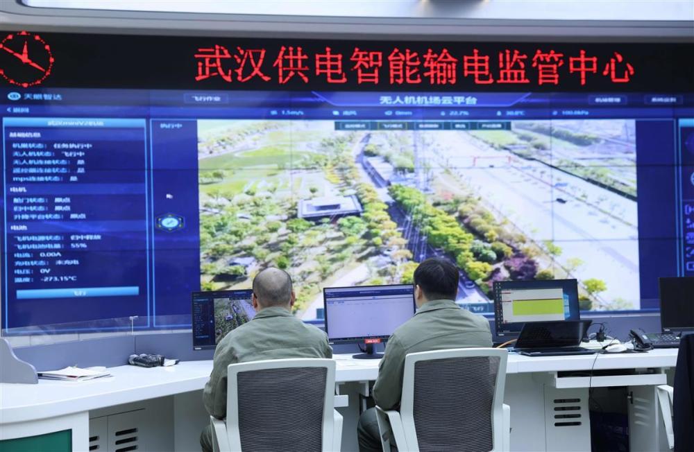 10月23日,武漢漢口江灘,一架白色的無人機在高空穿梭,機頭對準濱江區(qū)內的國家電網線路來回進行掃描、拍攝。與此同時,距離巡檢現場數公里外的國網武漢供電公司的巨型屏幕上,無人機的超高清畫面即時顯示。