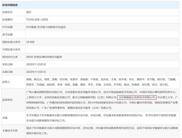本網訊 2023年11月1日,中國信息協會發(fā)布《科學數據安全能力成熟度評估規(guī)范》團體標準,并于11月1日起開始實施。網御星云作為主筆單位深度參與標準的編制,牽頭標準起草、修訂等一系列工作。