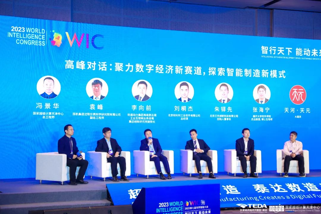 高峰對(duì)話環(huán)節(jié)由國(guó)家超級(jí)計(jì)算天津中心總工程師馮景華主持,圍繞“聚力數(shù)字經(jīng)濟(jì)新賽道,探索智能制造新模式”主題展開(kāi)探討。國(guó)機(jī)集團(tuán)沈陽(yáng)儀表科學(xué)研究院有限公司副總工程師袁峰;軟通動(dòng)力集團(tuán)高級(jí)副總裁,工業(yè)互聯(lián)網(wǎng)業(yè)務(wù)總裁,集團(tuán)創(chuàng)新研究院副院長(zhǎng)、李向前;北京和利時(shí)工業(yè)軟件有限公司總經(jīng)理、劉桐杰;北京蘭光創(chuàng)新科技有限公司創(chuàng)始人、董事長(zhǎng),朱鐸先;南開(kāi)大學(xué)軟件學(xué)院、杰出教授、博士生導(dǎo)師、張海寧;以及神秘的 AI 嘉賓-天河·天元,現(xiàn)場(chǎng)共話智能制造新模式,推動(dòng)數(shù)字經(jīng)濟(jì)發(fā)展。