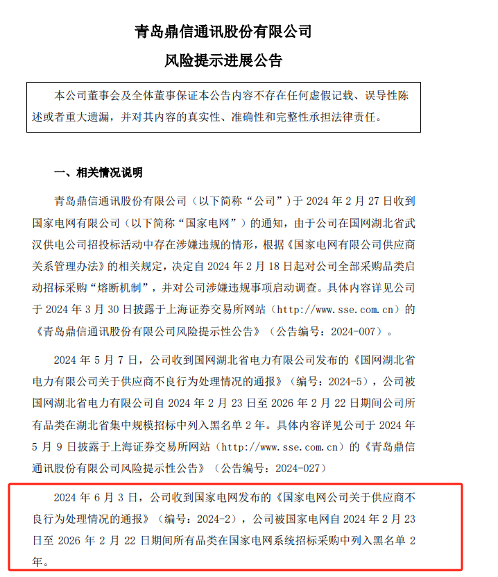 鼎信通訊6月4日晚間公告,6月3日,公司收到國(guó)家電網(wǎng)發(fā)布的《國(guó)家電網(wǎng)公司關(guān)于供應(yīng)商不良行為處理情況的通報(bào)》,公司被國(guó)家電網(wǎng)自2024年2月23日至2026年2月22日期間所有品類(lèi)在國(guó)家電網(wǎng)系統(tǒng)招標(biāo)采購(gòu)中列入黑名單2年。