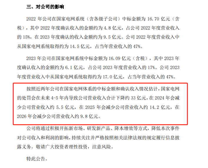 公告顯示,2022年鼎信通訊在國(guó)家電網(wǎng)系統(tǒng)(含各級(jí)子公司)中標(biāo)金額為16.7億元(含稅),其中2022年度確認(rèn)收入的金額約為4.8億元,占公司2022年度營(yíng)業(yè)收入的15%。公司2022年度營(yíng)業(yè)收入中,從國(guó)家電網(wǎng)系統(tǒng)取得約14.5億元,占當(dāng)年?duì)I業(yè)收入的47%。2023年,鼎信通訊在國(guó)家電網(wǎng)系統(tǒng)中標(biāo)金額為16.09億元(含稅),其中2023年度確認(rèn)收入的金額約為6.1億元,占公司2023年度營(yíng)業(yè)收入的17%。公司2023年度營(yíng)業(yè)收入中,從國(guó)家電網(wǎng)系統(tǒng)取得約17億元,占當(dāng)年?duì)I業(yè)收入的47%。按照近兩年公司在國(guó)家電網(wǎng)體系的中標(biāo)金額和確認(rèn)收入情況估計(jì),國(guó)家電網(wǎng)的處罰會(huì)在未來(lái)4-5年內(nèi)導(dǎo)致公司營(yíng)業(yè)收入合計(jì)下降約33億元,在2024年會(huì)減少公司營(yíng)業(yè)收入約5.5億元,在2025年會(huì)減少公司營(yíng)業(yè)收入約14.2億元,在2026年會(huì)減少公司營(yíng)業(yè)收入約9.8億元。