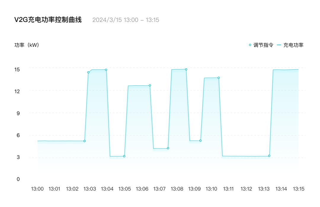 本次試驗設(shè)備采用廣汽能源20kW一體式V2G充電樁及昊鉑HT車型,試驗中,廣汽能源智慧管理云平臺模擬接收電網(wǎng)調(diào)控中心(虛擬電廠)的調(diào)頻指令,然后通過ADR技術(shù)連續(xù)15分鐘自動控制V2G充電及放電功率,秒級響應(yīng)虛擬電廠的調(diào)頻需求。