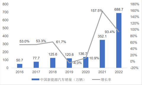 中國是全球最大新能源汽車市場之一,受政府鼓勵和市場推動,我國新能源汽車市場在近幾年得到高速的發(fā)展。根據(jù)中國汽車工業(yè)協(xié)會數(shù)據(jù),2022 年,中國新能源汽車持續(xù)爆發(fā)式增長,銷量達(dá)到 688.7 萬輛,同比分別增長 93.4%,市場占有率達(dá)到 25.6%,逐步進(jìn)入全面市場化拓展期,迎來新的發(fā)展和增長階段。