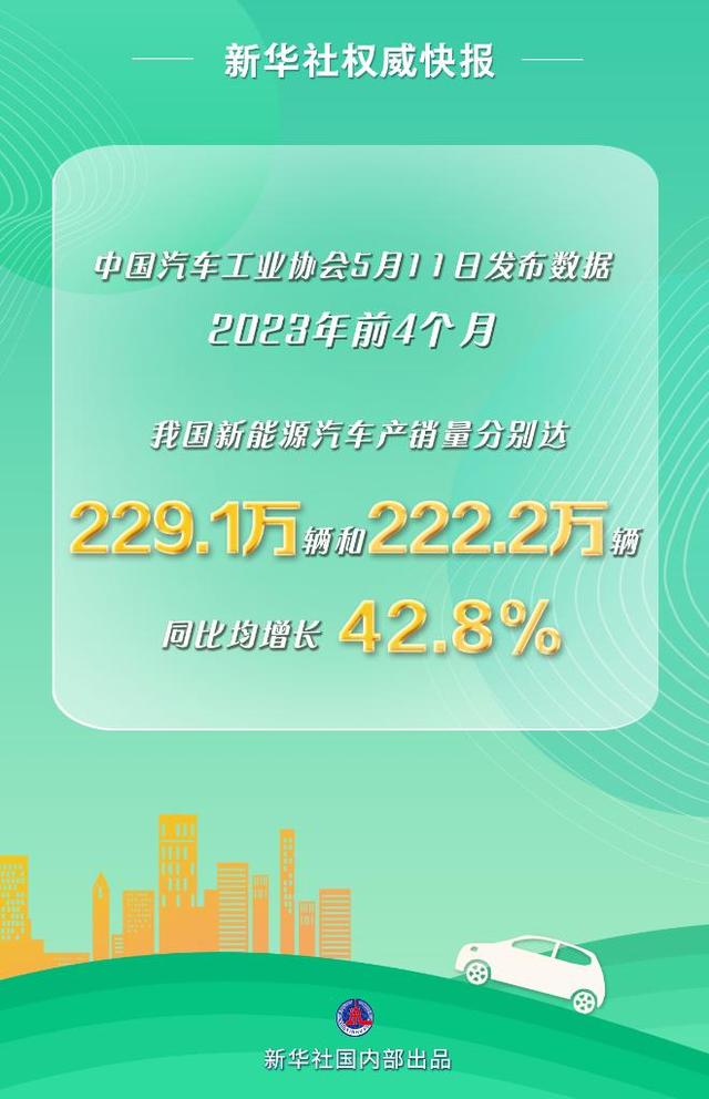 中國汽車工業(yè)協(xié)會5月11日發(fā)布數據顯示,2023年前4個月我國新能源汽車產銷量分別達229.1萬輛和222.2萬輛,同比均增長42.8%。