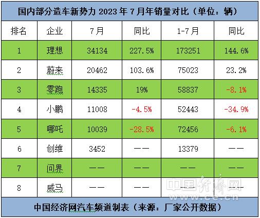 8月1日,幾家國內(nèi)造車新勢力的銷量數(shù)據(jù)如期而至。數(shù)據(jù)顯示,7月,理想、蔚來、零跑、小鵬和哪吒的銷量分別為34134輛、20462輛、14335輛、11008輛、10039輛,同比分別增長227.5%、103.6%%、19%、-4.5%、-28.5%;前7個月的累計銷量分別為173251輛、75023輛、58837輛、52443輛、72456輛,同比分別增長144.6%、23.2%、-8.1%、-34.9%、-6.1%。另據(jù)創(chuàng)維汽車官方發(fā)布的數(shù)據(jù)顯示,其7月共交付3452輛,其中海外出口974輛,同比增長151.42%。