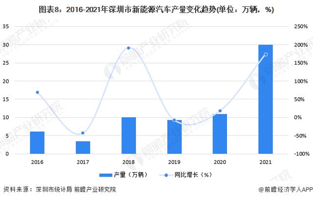 近年來,深圳市新能源汽車產(chǎn)業(yè)發(fā)展迅猛。2018-2020年,深圳市新能源汽車產(chǎn)量維持在9萬輛/年以上,2020年突破了10萬輛;2021年,深圳市新能源汽車產(chǎn)量逼近30萬輛,同比增長174%;同時,在新能源汽車的有效推廣下,全市公交出租均已實現(xiàn)電動化,2021年全市新能源汽車銷量14.48萬輛,占當年汽車銷量比重超40%。