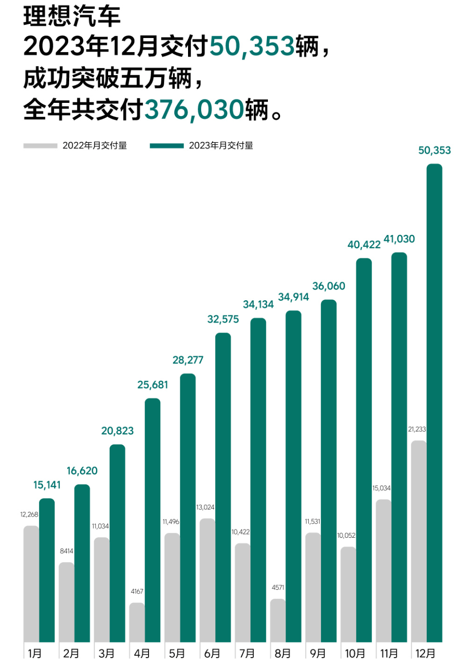作為新勢力的代表,理想汽車今年表現(xiàn)也同樣亮眼。其公布的數(shù)據(jù)顯示,2023年12月,理想汽車交付新車5.04萬輛,同比增長137.1%。這也是理想汽車首次月交付超過5萬大關(guān),兌現(xiàn)了CEO李想此前的承諾。整體來看,理想在2023年累計交付37.6萬輛,同比增長182.2%。截至2023年12月31日,理想汽車?yán)塾嫿桓读砍?0萬輛,是交付量最高的新勢力車企。