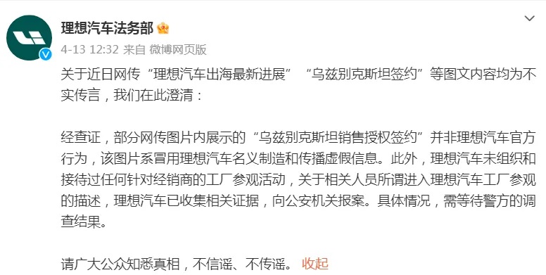 此外,@理想汽車法務(wù)部 日前發(fā)文稱,關(guān)于近日網(wǎng)傳“理想汽車出海最新進(jìn)展”“烏茲別克斯坦簽約”等圖文內(nèi)容均為不實(shí)傳言。
