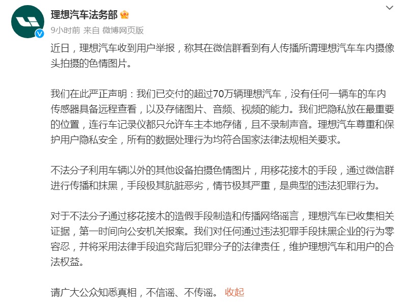 4月15日,@理想汽車法務(wù)部 發(fā)文稱,近日收到用戶舉報,稱其在微信群看到有人傳播所謂理想汽車車內(nèi)攝像頭拍攝的色情圖片。
