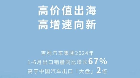 昨日,吉利汽車發(fā)布數(shù)據(jù)顯示,2024年上半年吉利汽車出口累計銷量達19.74萬輛,同比增長67%,高于中國汽車出口大盤兩倍,銷量、增速均創(chuàng)歷史新高。