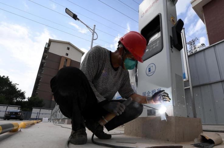 8月15日,在湖畔嘉苑麗景苑東北角停車場新能源汽車充電樁城市基礎(chǔ)配套設(shè)施停車場,施工人員正對45個充電樁進行最后的安裝調(diào)試。