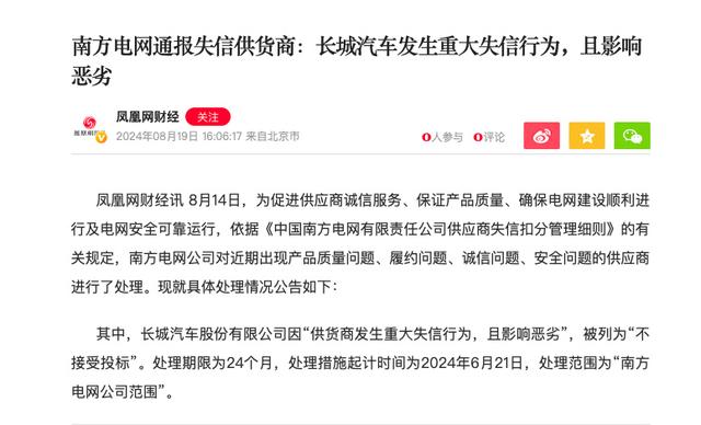 其中,長城汽車股份有限公司因“供貨商發(fā)生重大失信行為,且影響惡劣”,被列為“不接受投標”。處理期限為24個月,處理措施起計時間為2024年6月21日,處理范圍為“南方電網(wǎng)公司范圍”。