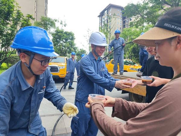 6月22日,桂林市萬達(dá)翰林府小區(qū)群眾為正在開展搶修復(fù)電的南方電網(wǎng)廣西欽州靈山供電局黨員突擊隊(duì)員們送上綠豆湯。陳心誠攝
